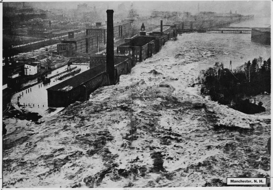 Manchester began as a small farming village located several miles east of the Merrimack River. It was originally called Derryfield. The town’s potential as an industrial center was first recognized by Samuel Blodget, local businessman, inventor, and entrepreneur who built a canal-and-lock system on the Merrimack River near the Amoskeag Falls. When Blodget’s canal system opened in 1807, it allowed boats travelling between Concord and Nashua to bypass the steep falls completely, thereby providing for water travel north of the falls, which opened this area of the state to development. At that time, water travel was the most efficient way to transport goods and people, so the navigability of the Merrimack, the largest river in central New Hampshire, was of prime importance. Within a few years, through the construction of other canals and locks, the Merrimack would link Concord to Boston, opening up for central New Hampshire all sorts of possibilities for trade and industry.