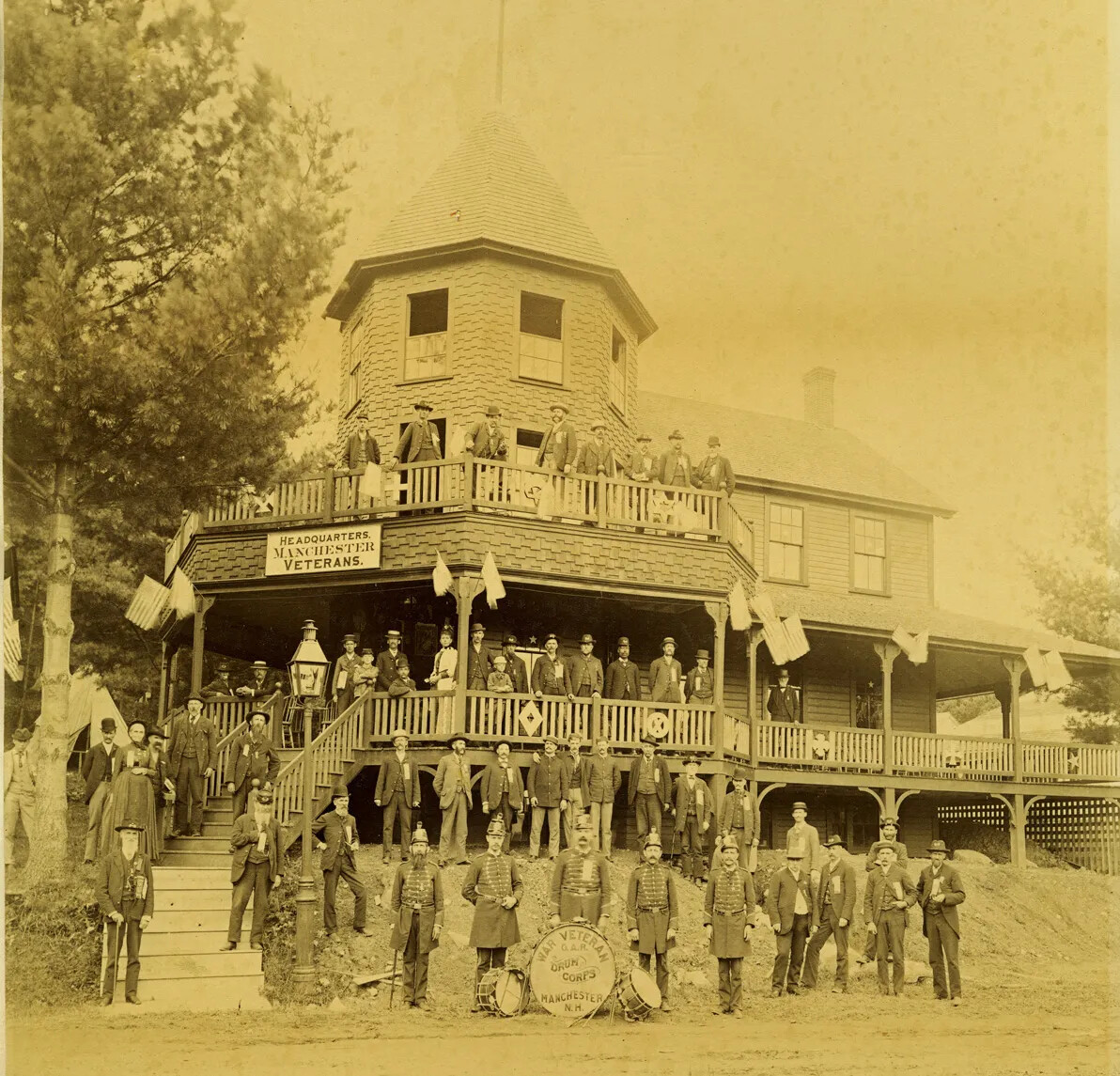 Beginning in the early 1870s, veterans’ organizations began hosting reunion events that usually consisted of a banquet and speakers. In 1875, the New Hampshire Veterans’ Association brought all of these groups under one umbrella organization with the goal of maintaining the bonds among former soldiers. That fall, the group hosted a statewide soldiers’ reunion held over three days in October at the Manchester fairgrounds.
