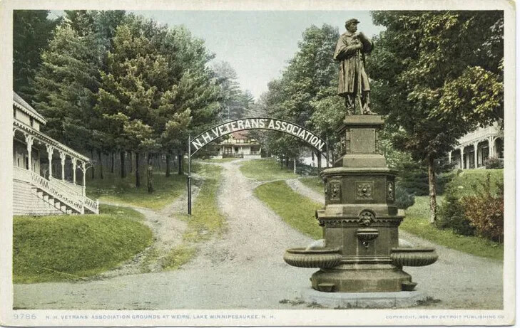 The Weirs Beach Veterans Campground in the Lakes Region of New Hampshire was the national headquarters of veterans reunions after the Civil War. Not only a site for statewide reunions, it also welcomed Union veterans and their families from across the North, as well as housing a pavilion for the national veterans organizations. No other states had such extensive or active veterans campgrounds.